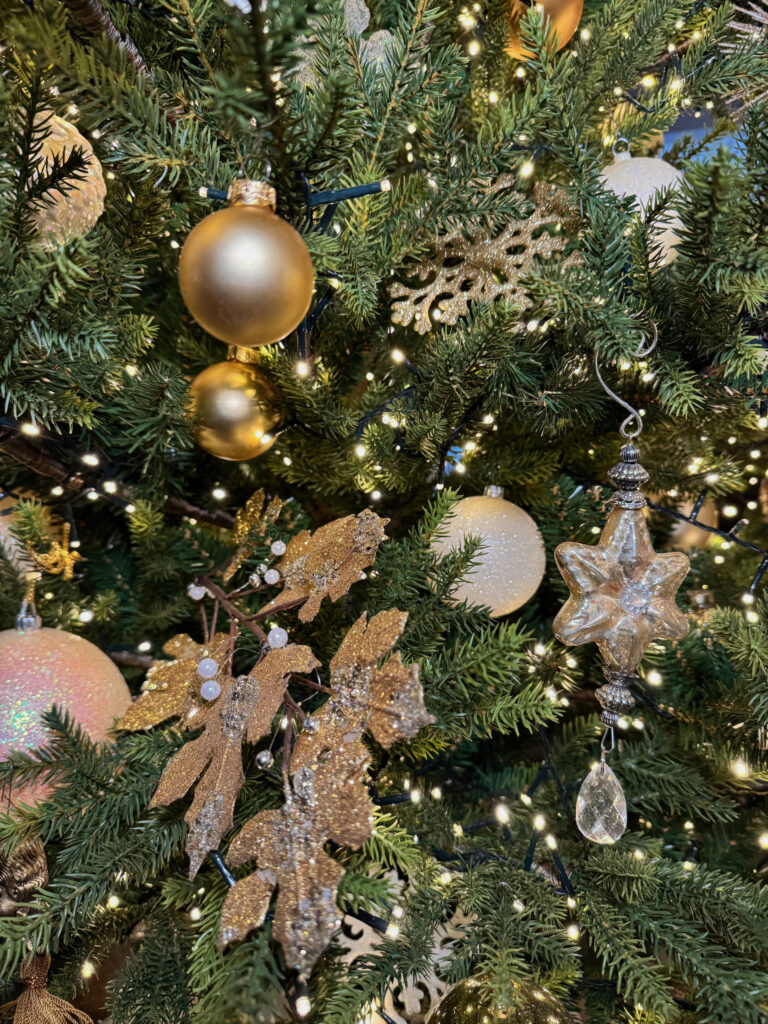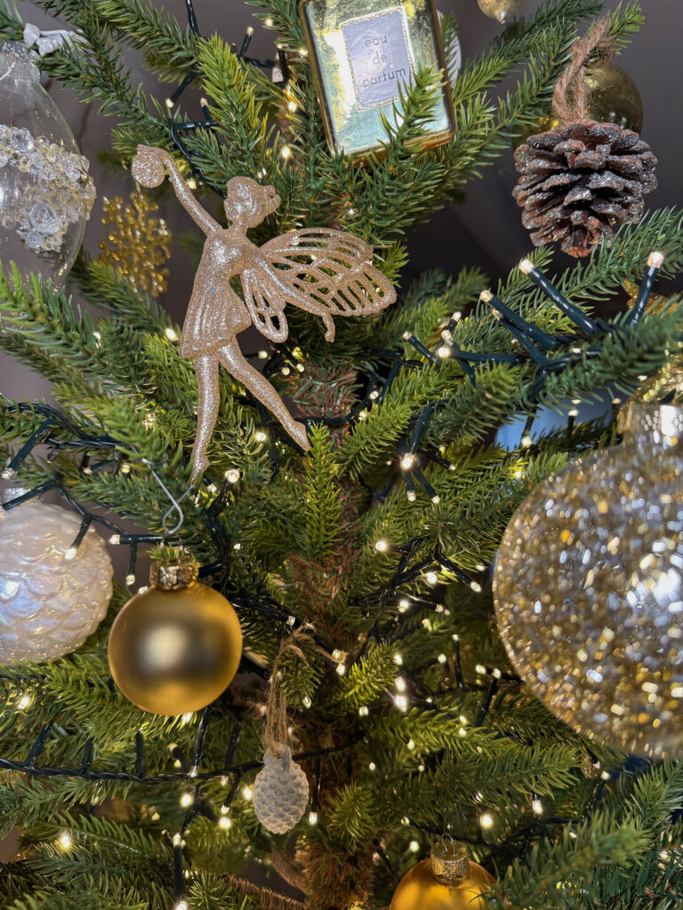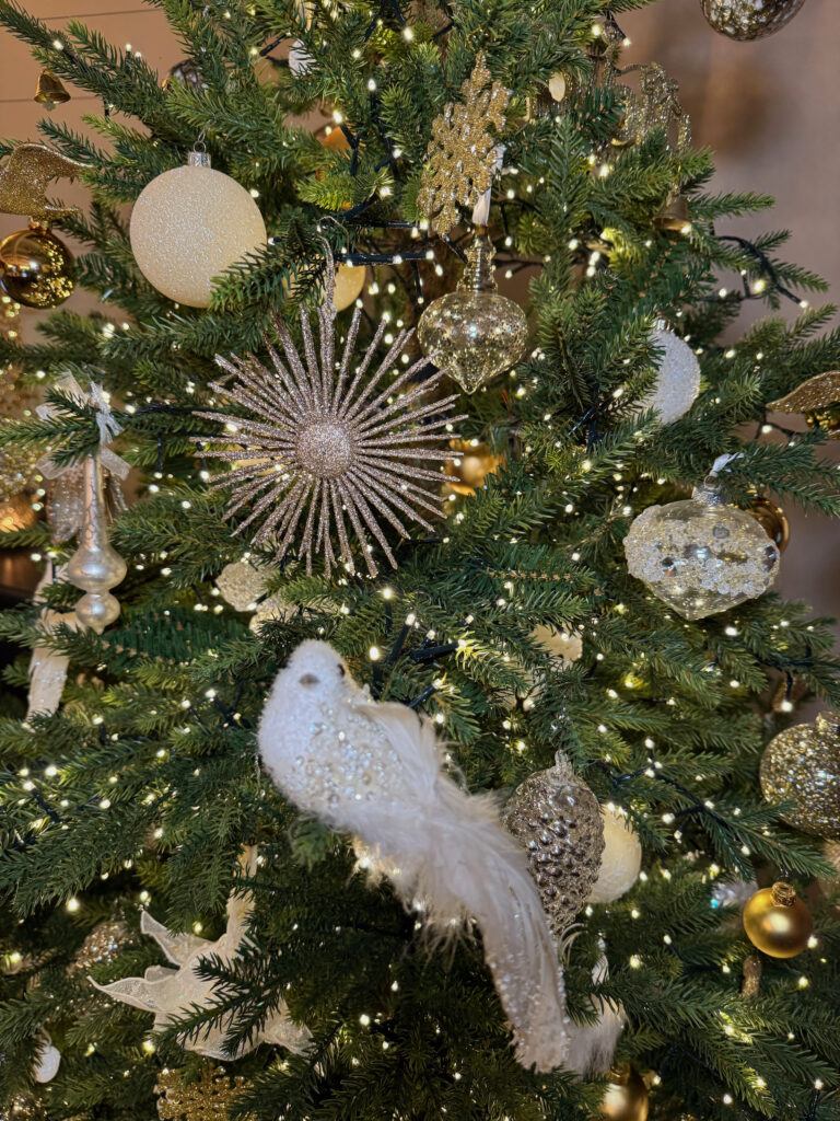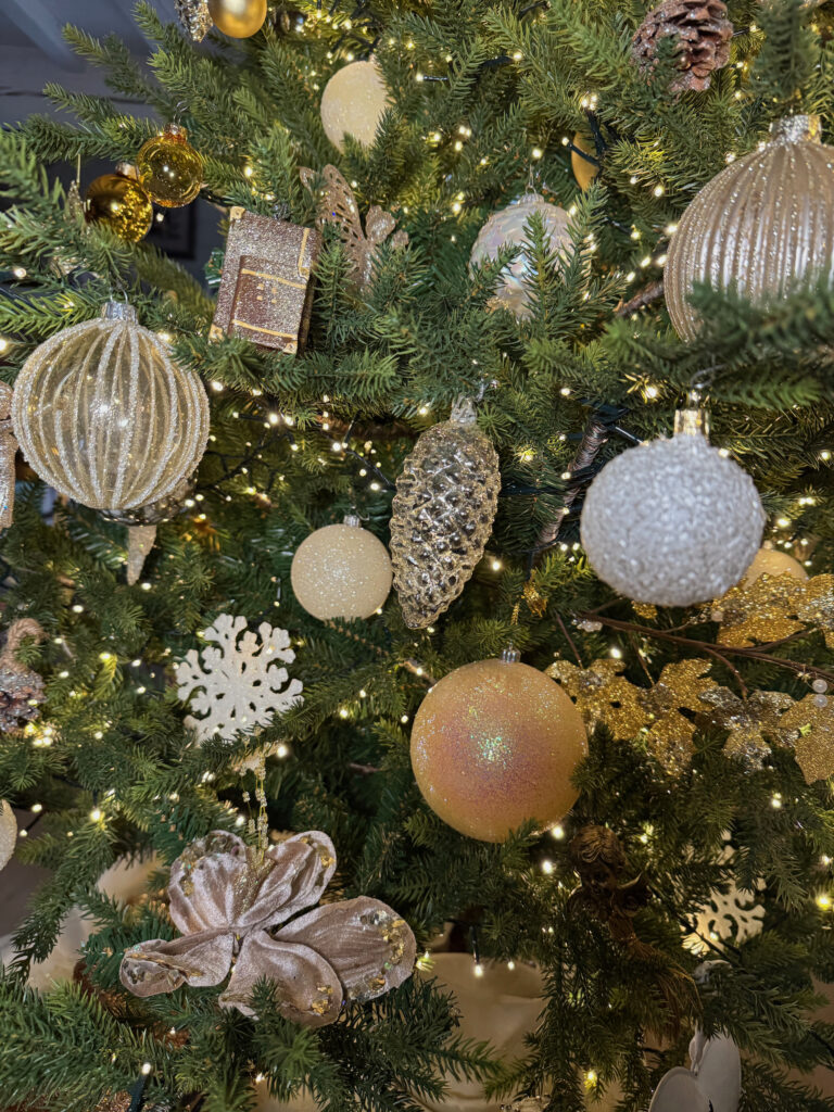 De boom is rijkelijk versierd in de tinten goud, wit en taupe, en straalt pure elegantie uit. Met maar liefst 1000 kleine lichtjes fonkelt hij in elke ruimte en vormt hij een indrukwekkend middelpunt van de kerstviering. De decoratie bestaat uit sneeuwvlokken, dennenappels, elanden, sterren en speciale kerstballen, die samen een warme winterse sfeer oproepen. Elk detail is zorgvuldig gekozen om een harmonieus en feestelijk geheel te creëren.